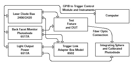 Figure 5 shows the basic core of a test system consisting of one Model 2400 SourceMeter instrument, two Model 6517A electrometers, and a PC equipped with a GPIB interface card. (If the LD modules require more than 1A but less than 3A of drive current, substitute the Model 2420 SourceMeter instrument for the Model 2400.) The Model 2400 is programmed to provide a current sweep to drive the LD and to synchronize the measurements made by the Model 6517A electrometers via the Trigger Link cables and Trigger Link Adapter box. The PC programs the meters via the GPIB bus, coordinates the execution of the test, and collects and analyzes the measurement results. Each instrument is equipped with a data buffer (sometimes called a trace memory) that allows readings to be stored internally until the test is complete. This data buffer, in conjunction with Trigger Link, allows the L-I-V test sweep to run at hardware speeds independent of the PC and GPIB interface. Once the test is complete, the readings in the data buffer are collected via the GPIB and analyzed in the PC.