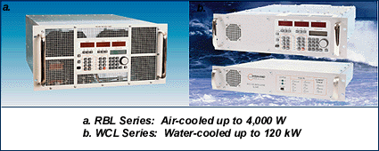 Electronic loads convert electrical power into heat. The ability of the load to transfer this heat into the environment is the key to the overall power rating of the device. The two basic ways of removing heat are to simply force air over the heatsinks (as in Dynaload's RBL Series) or use water as the medium to cool the heatsinks (as in Dynaload's WCL Series) - Refer to Figure 1 below. Each of these methods has advantages and disadvantages that will now be reviewed in detail.