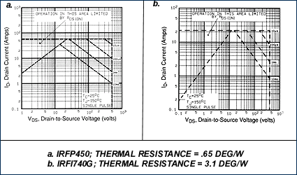 In an air-cooled design, the surface area of the heatsink, the airflow, and the temperature of the ambient air determine the heat transfer coefficient. In order to achieve higher power levels, the only choices are to increase the size of the heatsink, increase the airflow, or both. This philosophy will work when the power levels are relatively low and space is not limited. What drives the physical size of most electronic loads is the rate of power dissipation. The limiting factor in dissipation is always the maximum junction temperature of the semiconductors used to dissipate the power. The typical power semiconductor will have a maximum junction temperature of 150°C as an absolute limit. A review of the typical safe operating curves will show that different package styles offer different thermal transfer coefficients between the junction and case of the device (see Figure 2 below):